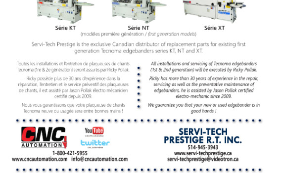 In order to further enhance our outstanding service Servi-Tech prestige R.T. Inc. since September 2013, has become officially the exclusive distributor of replacement parts of all the first generation TECNOMA edgebanders. This new addition to the Servi-Tech offering will provide you with spare parts in a shorter time delay. Servi-Tech Prestige R.T. Inc. […]